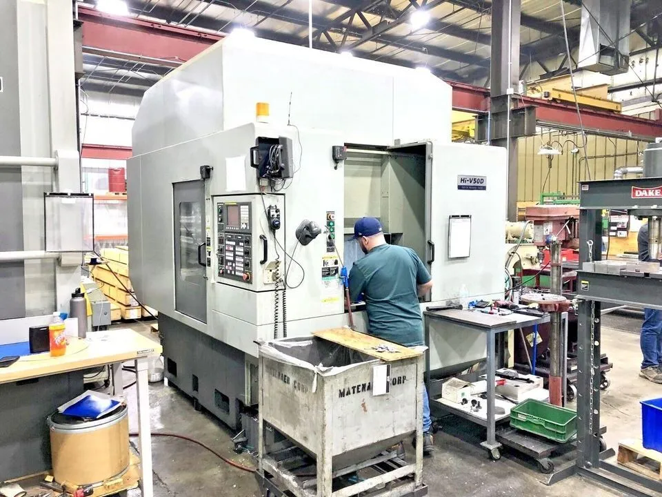 VMC in use. Features: 23.6" x-axis, 18.1" y-axis, 22.4" z-axis, 20 hp, 10K RPM, Cat 40 taper, with dual rotating pallet table and FANUC controls. Includes coolant system, chip conveyor, and more.