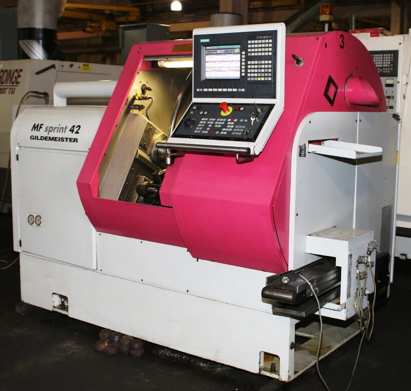 CNC Lathe. Key specs: 280 mm machining length, 1.65" bar capacity, 21 kW power, 6,300 RPM max, 4.92" turning dia. Equipped with SIEMENS 840C CNC Control, FMB Turbo Magazine Barloader, 8-position turrets, parts and chip conveyor.