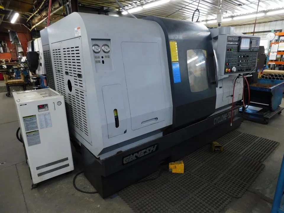 CNC lathe with 2" bar capacity, 20 hp power, and max RPM of 6,000. Equipped with Mitsubishi M700 CNC control, live tooling, B-axis, C-axis, Y-axis, dual 8" 3-jaw powered chucks. Max cutting length 31.10", max diameter 7.48".