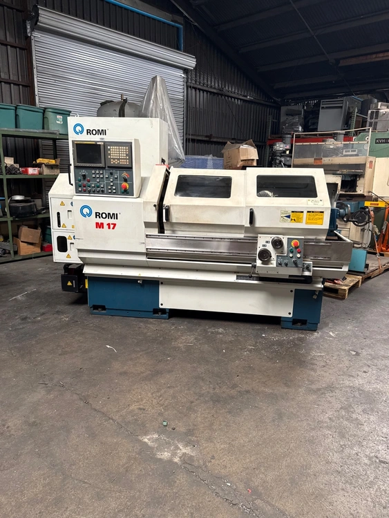 2004 ROMI M17 CNC Lathe. Features include 16.93" swing, 43" machining length, 8" chuck size, 10 hp, and tailstock. 2-axis configuration and 3,000 RPM max speed.