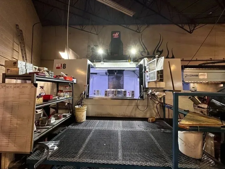 2020 HAAS VR-8 Vertical Machining Center features a 2-axis gimbaled spindle head, 24-HP 20,000-rpm HSK-A63 spindle, 50+1 tool changer, and 95-gallon coolant tank.