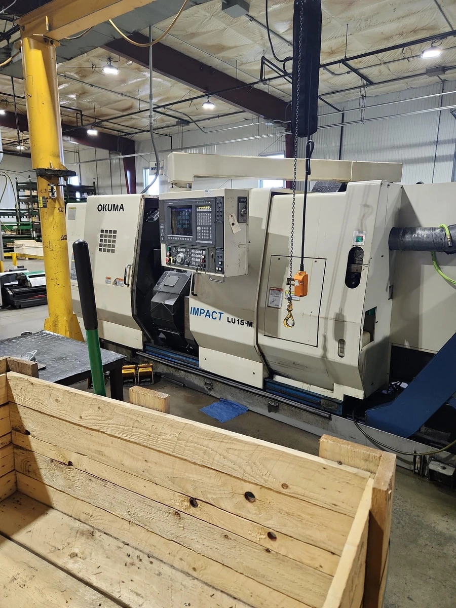 2002 OKUMA IMPACT LU-15M CNC Lathe for sale. Features 20.87" swing, 509mm machining length, 8" chuck, 22 hp spindle, max 4 RPM, 13.38" turning dia. Equipped with live tooling, dual turrets, tailstock, and hydraulic steady rest. Used condition.