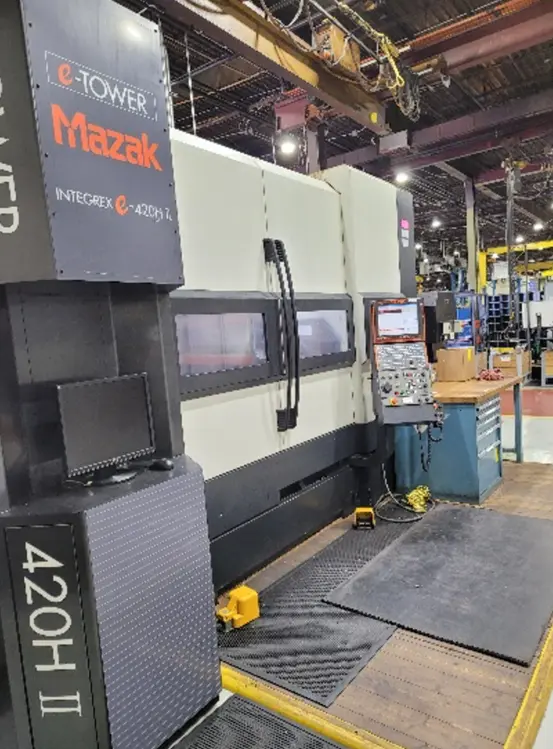 Used MAZAK INTEGREX E-420HSII for sale, featuring 5-axis CNC operations, 7 axes, and 24.02" turning diameter. Equipped with a 15" main and sub chuck, 10,000 RPM milling spindle, and 80 ATC positions.