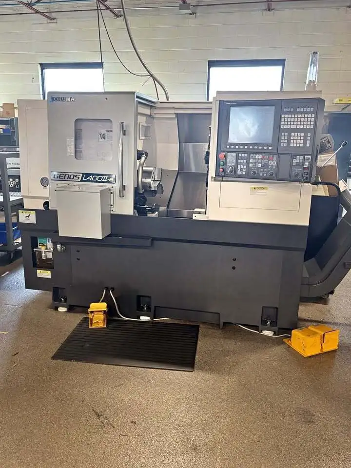 Used 2023 OKUMA Genos L400II-E CNC lathe. Featuring a 20.47" swing, 16.69" machining length, and 15 hp power, it's equipped with a programmable tailstock, chip conveyor, OSP-P300LA control, and more.
