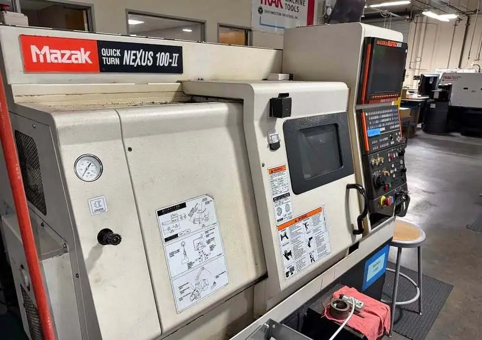 2006 MAZAK QUICK TURN NEXUS 100-II CNC Lathe available. Features: 21.6" swing, 12.1" machining length, 2-axis, 6" chuck, 2" bar capacity, 15 hp, up to 6,000 RPM, 11" turning dia, and tailstock.
