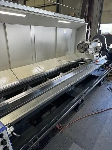2023 WEILER E90 x 236" CNC Lathe used but powerful; 35.43" max swing, 236" centers, AC 60/50 hp motor, 1-500 rpm. Equipped with Weiler ONE1 CNC, quick-change tool post, 4-jaw chuck, steady rest, and more.