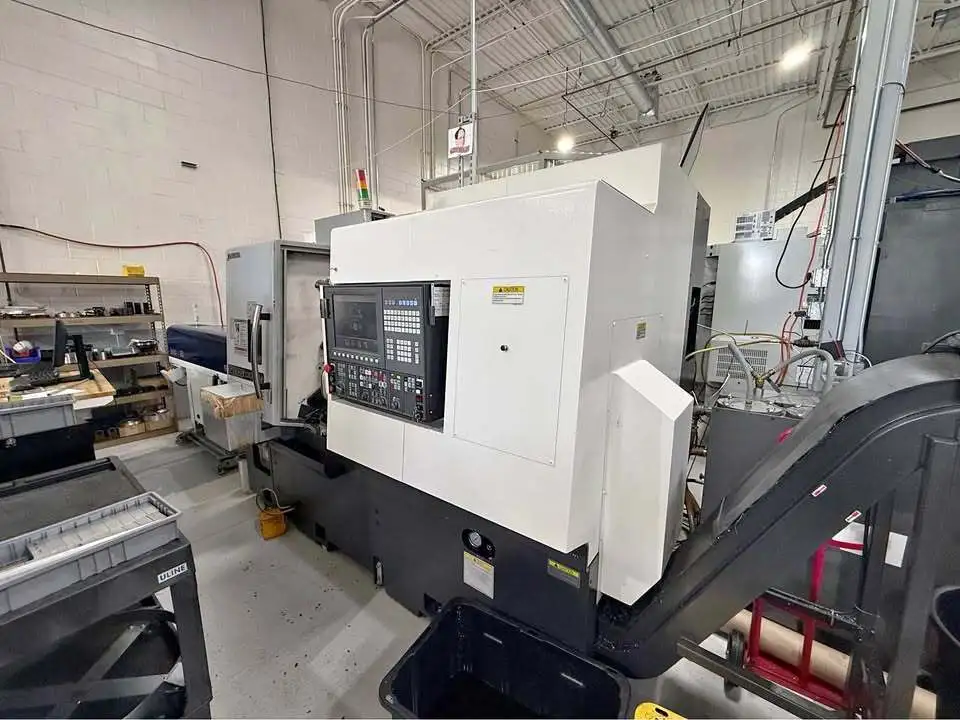5-axis CNC lathe used with OSP-P300LA-e control, 15 hp, 3,800 RPM max, and 10" chuck. Features Y-axis, tool stations, 1000 PSI coolant pump, modified parts catcher, and Edge Technologies Rebel V-80 bar feeder.