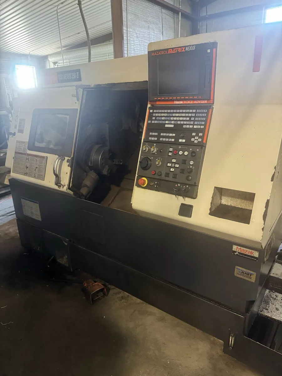 MAZAK QUICK TURN NEXUS 250-II used CNC lathe offers 26.5" swing, 22" machining length, 13.78" turning diameter, and 10" chuck size. Features 2 axes, 3" bar capacity, 35 hp power, and max speed of 4,000 RPM. Includes tailstock.