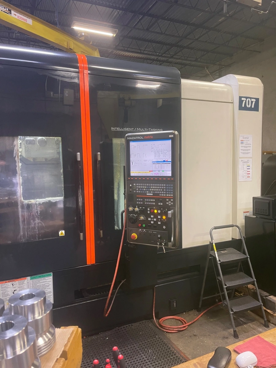 MAZAK INTEGREX E-420HII 5-axis CNC lathe, 2011 model, used. Features a 60" machining length, tailstock, 120 ATC, CAT40 spindle, and chip conveyor.