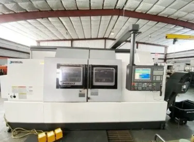 CNC Lathe in used condition offers a 26.38" swing, 60" machining length, and 14" chuck size. Features 7.5" bar capacity, 4,200 RPM max, 18.9" turning diameter, chip conveyor, and OSP-P200 control system.