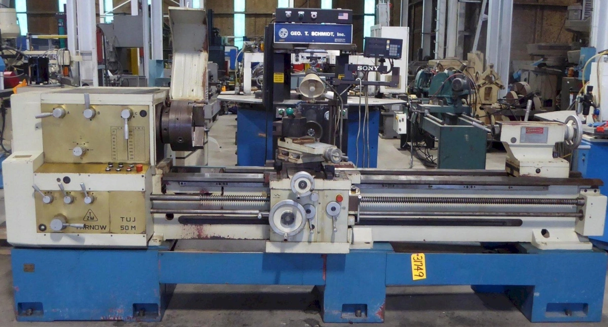 Engine Lathe: 22" swing, 80" centers, 18-speed spindle to 1600 RPM, 3-1/2" bore, Sony digital readout, 15 HP motor. Features hardened bed ways, quick-change tool post, and splash guard.