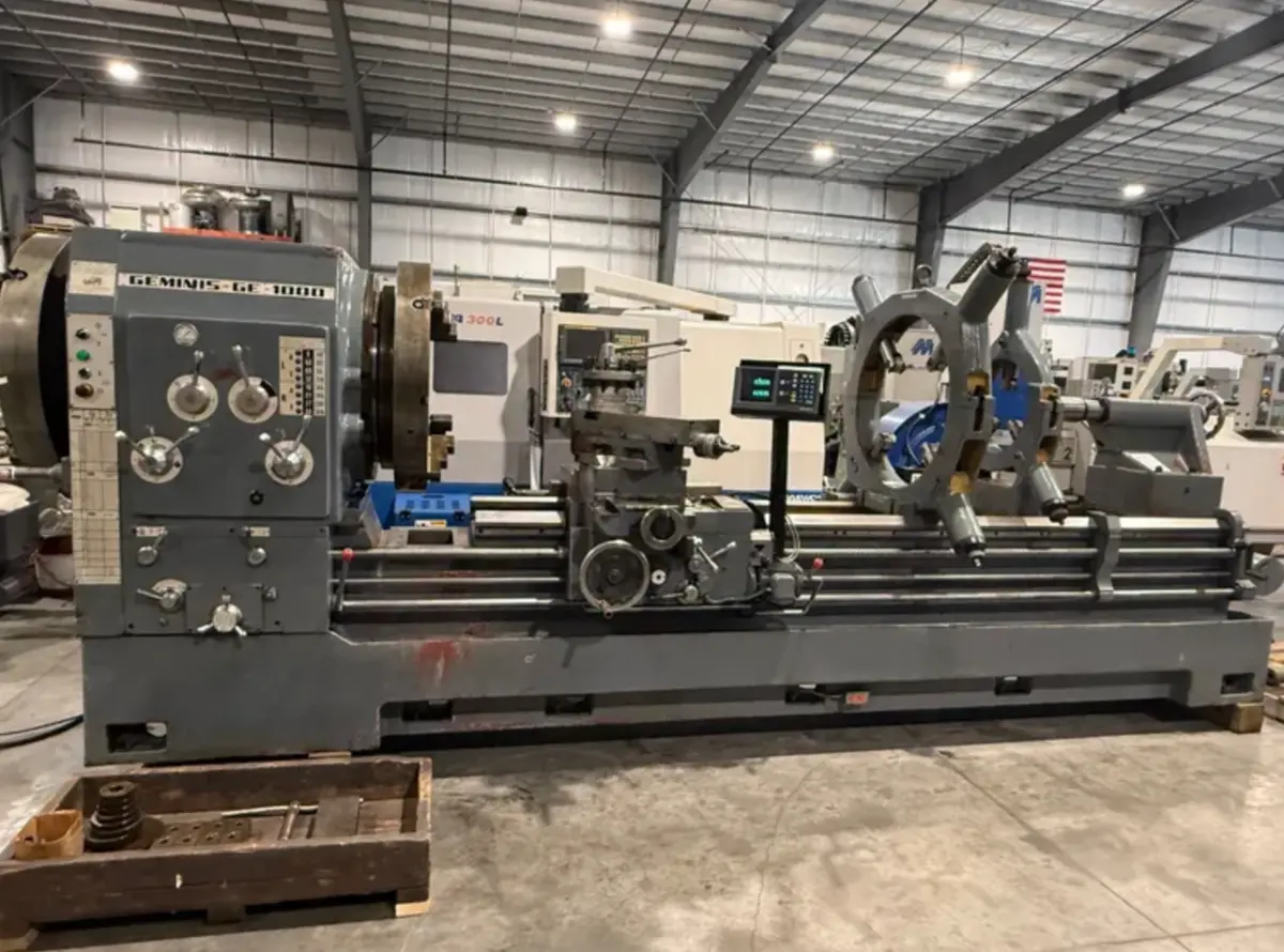 Engine Lathe, used but robust with 39-3/8" swing over bed, 120" between centers, and a 20.25" spindle bore. Features include ACURITE DRO, 30 H.P. motor, and multiple steady rests.