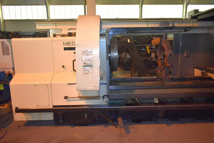Used CNC Lathe featuring a 24.5" chuck, 6.1" spindle bore, Siemens CNC control, and a 4-position hydraulic turret. Capable of 40-750 RPM spindle speeds, it offers 39.3" max cutting diameter and comes with a full-length chip conveyor.