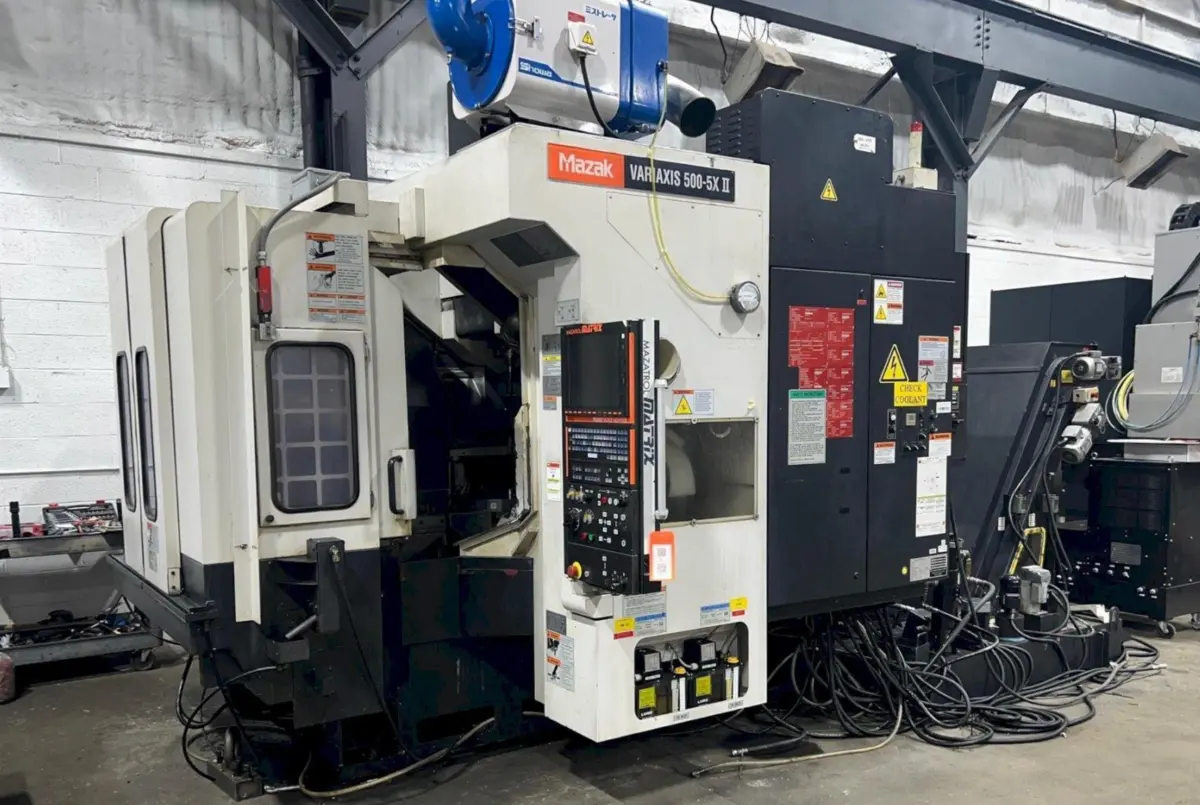 Used Vertical Machining Center. Features 5-axis capability, 20" travel on X/Y, HSK-63A spindle at 12,000 rpm, and 661 lb max table load. Includes Mazatrol Matrix CNC, spindle coolant, chiller, and probing.