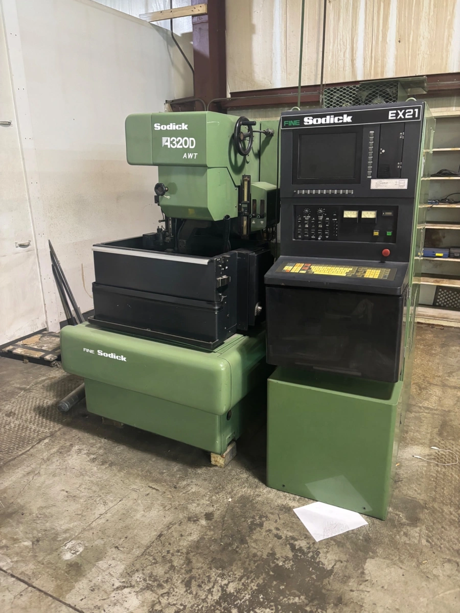 1995 SODICK A320D Wire EDM for sale, used condition. Specs: 12.5"x8"x6.8" table travel, 21.2"x14.1"x6.8" max workpiece, 770 lbs capacity, CNC Control EX21. Power: 200/220V, 16kVA. Includes dielectric filtration and submersible flushing.