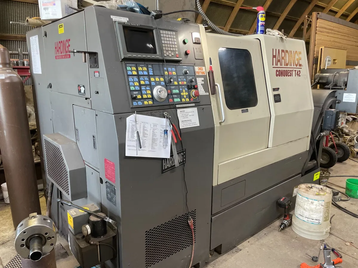 1995 Hardinge Conquest T42 CNC lathe in used condition, featuring a 21.2" swing, 13.1" machining length, 2-axis control, 6" chuck, 1.625" bar capacity, 10 hp power, 5,000 max RPM, 9" turning diameter, and a chip conveyor.