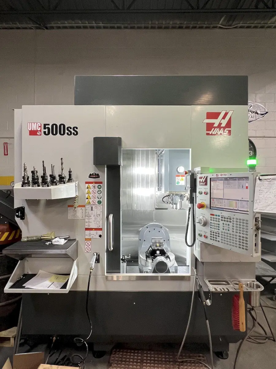 Used 2022 HAAS UMC-500SS Universal Machining Center with 24"x16"x16" travel, 12,000 RPM spindle, 30 HP, and 30+1 ATC. Features include through-spindle coolant, auto door, belt chip conveyor, programmable coolant nozzle, and inline direct-drive.