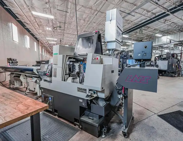 Edge Patriot 551 bar loader with multiple channel sets, LNS chip conveyor, MP Systems V2 high pressure pump, TriMist mist collection, and fire suppression. All collets and guide bushings pictured included.