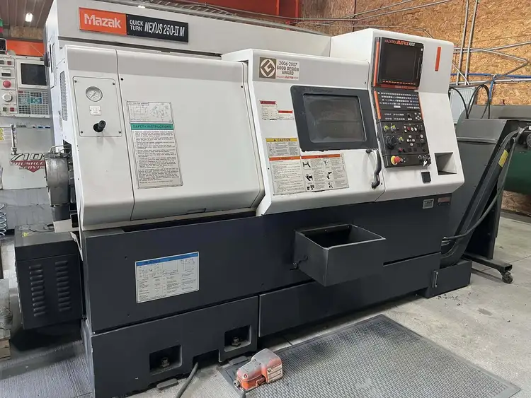 2007 MAZAK QUICK TURN NEXUS 250-II M CNC Lathe features a 26.5" swing, 22" machining length, and a 35 hp motor capable of 4,000 RPM. It includes live tooling, hard jaws, and is bar feeder ready.