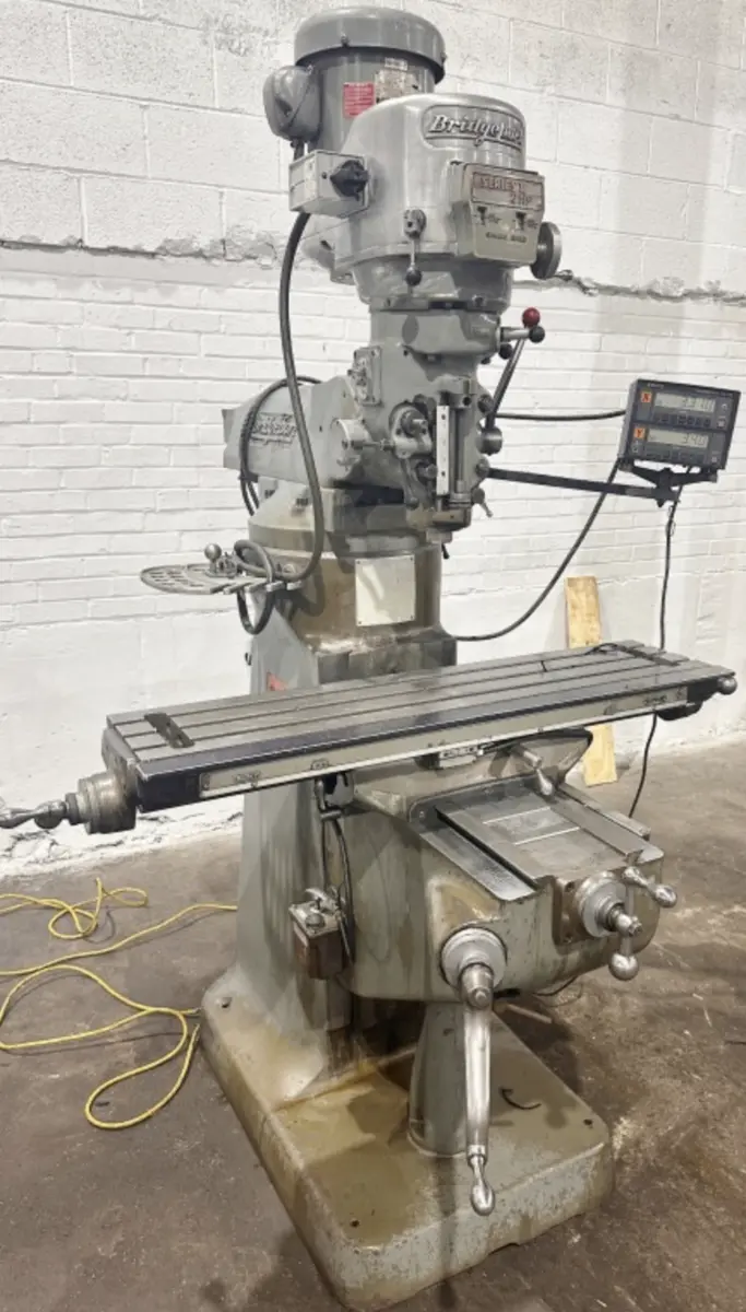Used Vertical Mill available. Features a 9" x 42" table, Sony DRO, and variable speed. Wired for 230V. Weighs 1,950 lbs.