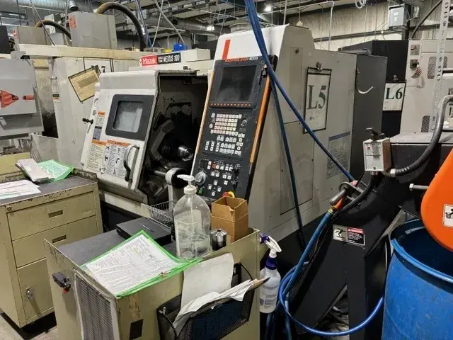 2004 MAZAK QUICK TURN NEXUS 100-II CNC Lathe; 21.6" swing, 12.1" machining length, 2-axis, 2" bar capacity, 15 hp, 6,000 RPM, 11" turning dia, includes tailstock and chip conveyor.