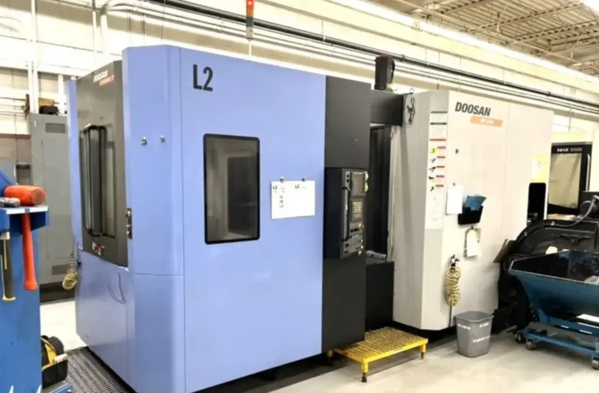 2008 DOOSAN HP 5100 Horizontal Machining Center, 4-axis, 30 hp, 14,000 RPM, CAT 40 taper. Equipped with FANUC 18i-MB control, through-spindle coolant (1,000 PSI), chip conveyor, 60 tool positions. X/Y/Z: 33.5"/27.6"/29.5".