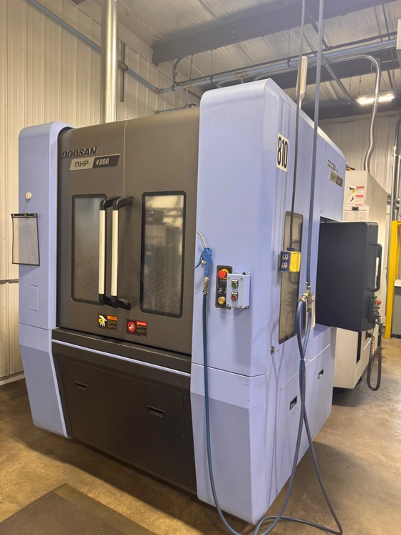 Used 2021 Doosan NHP 4000 Horizontal Machining Center available. Features 4-axis capability, 15,000 RPM, and 40.2 hp power. Equipped with overhead hydraulics and approx. 2000 hours of use. Specs: X 22", Y 25.2", Z 26", Pallet 15.75".