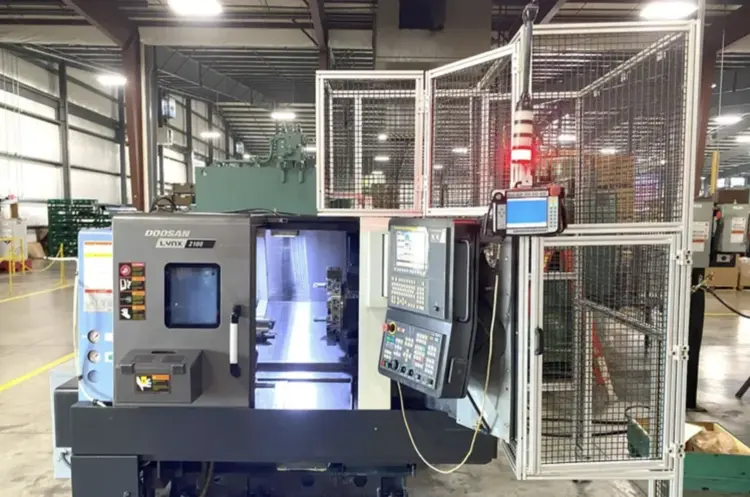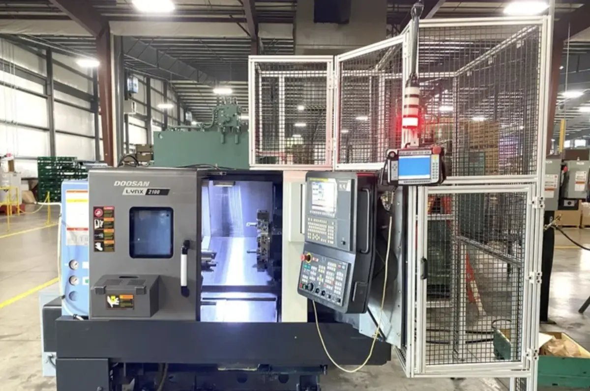 2016 DOOSAN LYNX 2100A CNC Lathe with DENSO 6-axis robot loader. Features include 23" swing, 20 hp power, max 6,000 RPM, and FANUC i-Series control. Includes tool presetter, parts catcher, chip blaster, coolant system, and more.