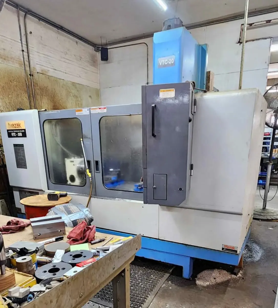 Vertical machining center, used. Features 44" X-axis, 20" Y & Z, 15 hp, 8,000 RPM, 24 ATC, CAT-40 taper. Includes Mazatrol MPlus, automatic tool measurement, 24 tool changer, and 6 tool holders. Floor size: 10ft x 10ft.
