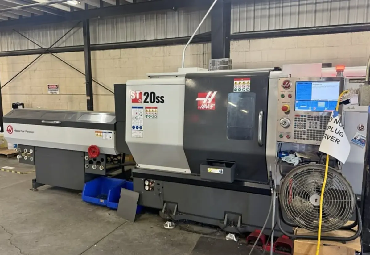 Used CNC Lathe: 31.75" swing, 21" machining length, 2-axis with 8.3" chuck and 2" bar capacity. Features 30 hp, 5,000 RPM, HAAS control, bar feeder, live tooling, tool presetter, chip conveyor.