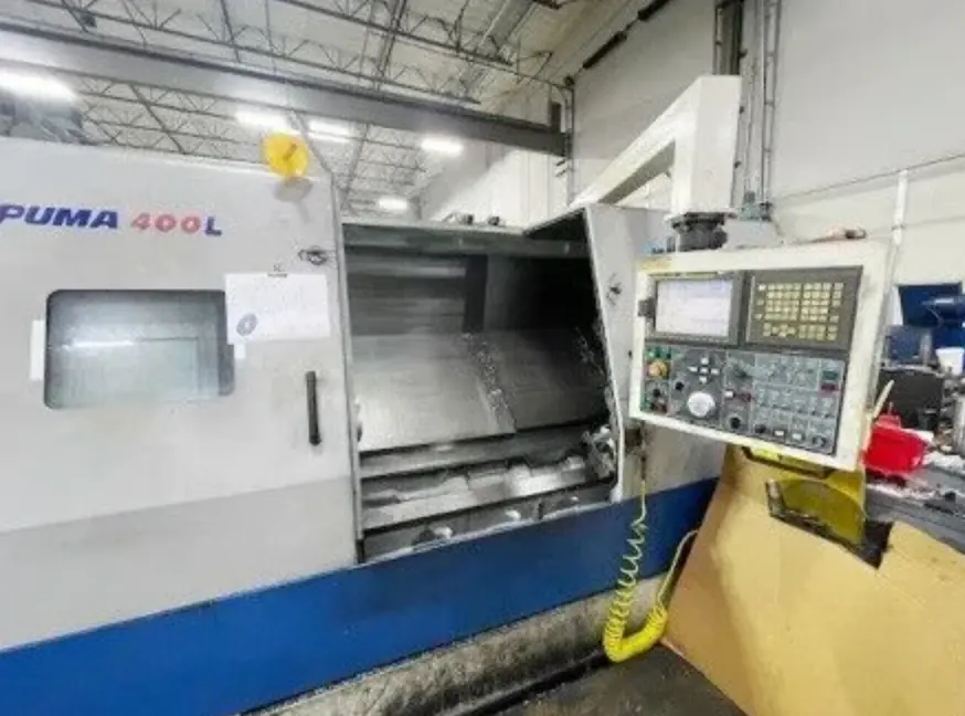 Used CNC lathe, equipped with Fanuc 21i-TB, 3-point steady rest, chip conveyor, hydraulic tailstock, and PCMCIA card interface. Features a 15" chuck, 6.5" bar capacity, and 30 hp motor. Swing 30.3", machining length 81.7".