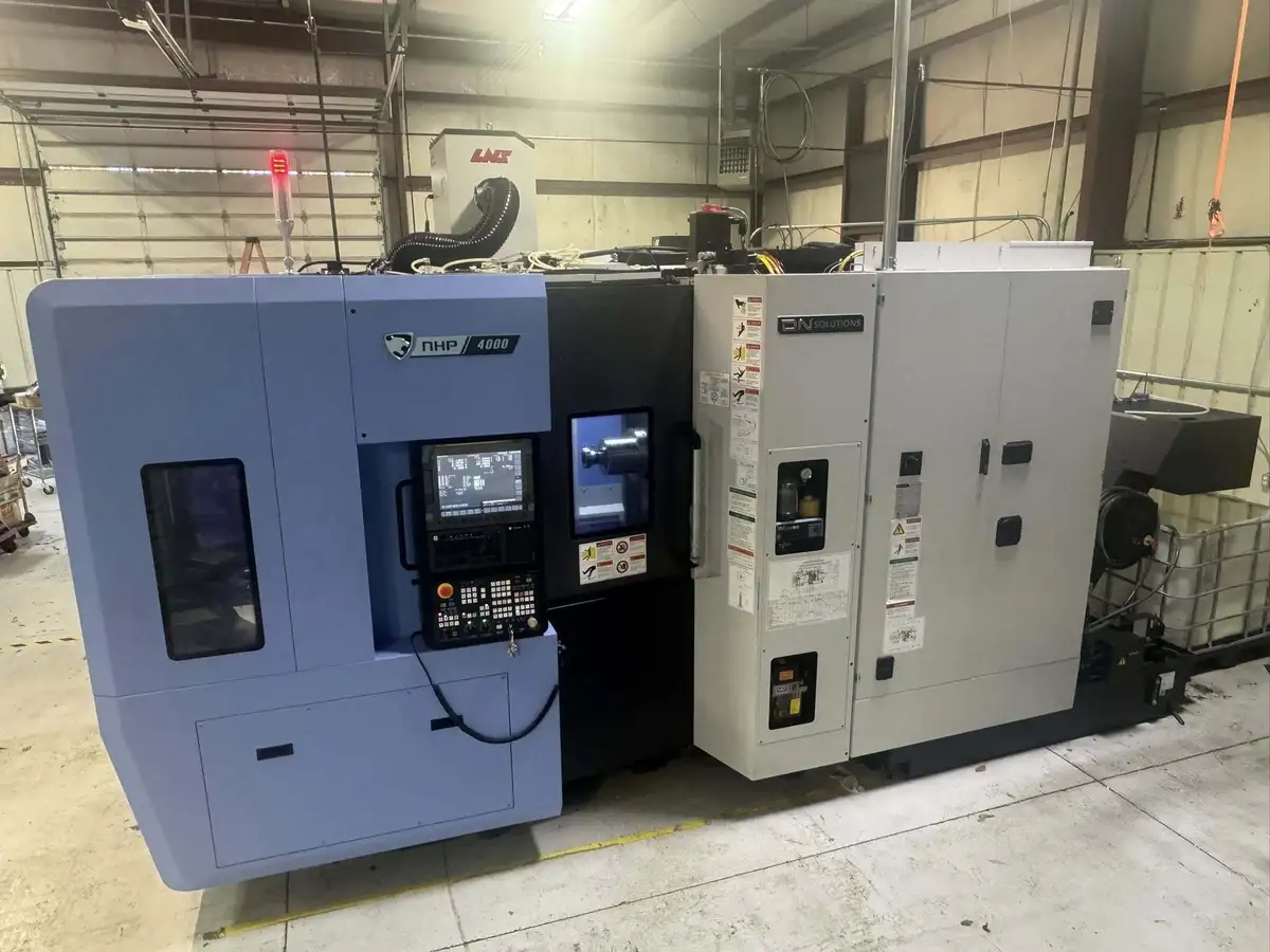 2024 Doosan NHP 4000 Horizontal Machining Center: Used, with a 22"x25.2"x26" travel range, 40.2 hp, 15,000 RPM, CAT 40 taper, and a 60-tool ATC. Comes with 2 tombstones, a chip conveyor, and a mist collector.