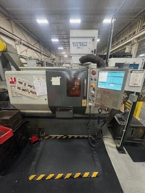 Used CNC Lathe: Features a 25.25" swing, 16.5" machining length, 2-axis operation, 6.5" chuck, 1.75" bar capacity, 15 hp, and 6,000 RPM. Includes parts catcher, chip conveyor, tool presetter, and Edge Patriot 338 barfeed.