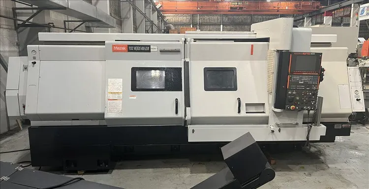 2008 Mazak Quick Turn Nexus 400-II M CNC lathe. Max swing: 33", machining length: 78.7". Features 12-position turret, 2500 RPM spindle, 50 HP motor. Equipped with Mazatrol Matrix Nexus control, chip conveyor, SMW Autoblok steady rest, live milling.