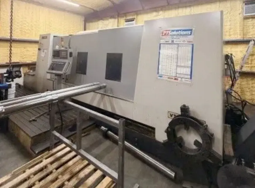 CNC lathe, used. Features include a 39.37" swing, 33.85" max cutting diameter, and a 12.25" spindle bore. Comes with a chip conveyor, programmable tailstock, and RIP steady rest.