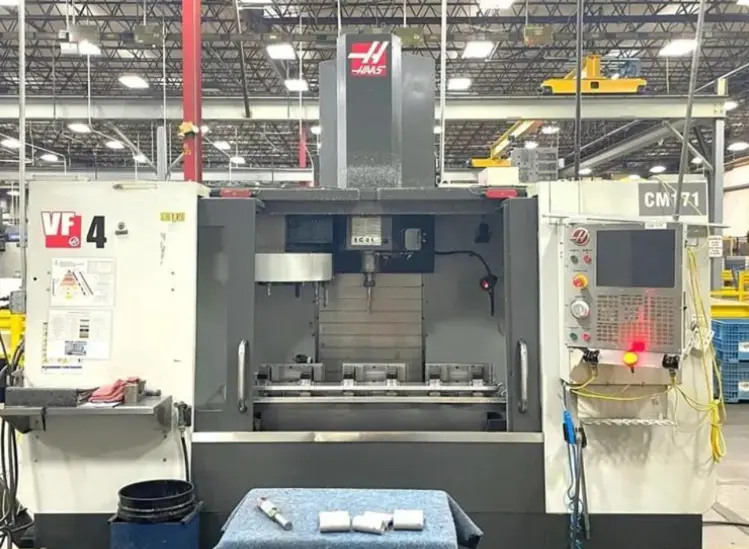 2014 HAAS VF-4, excellent for vertical machining. Features 50" x 20" x 25" travel, 30 hp, 8,100 RPM spindle, CT/BT 40 taper, and 20 station ATC. Equipped with a chip conveyor, programmable coolant, and intuitive programming.
