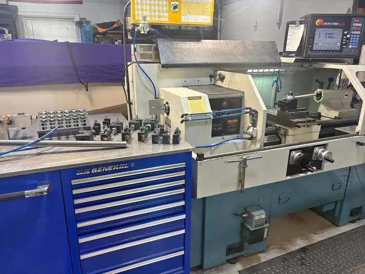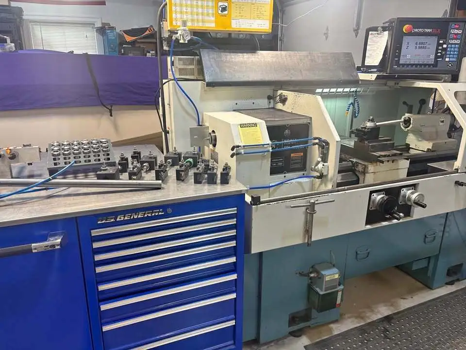 Used Southwestern Industries TRAK TRL 1630SX CNC Lathe, 16" swing, 30" machining length, 7.5 hp, 2,500 RPM max. Includes American rotary phase converter, collet closer, collet spindle nose, tooling, and gang tooling block.