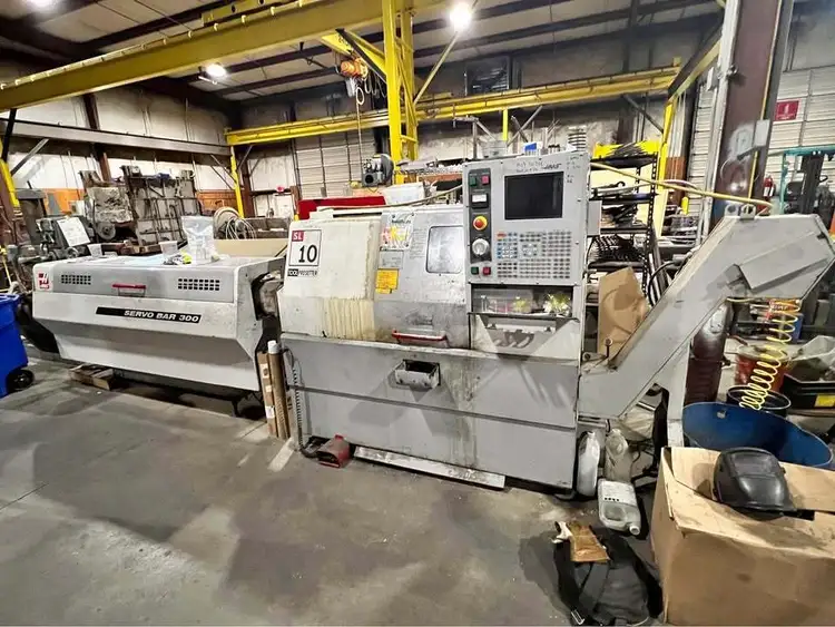 2001 HAAS SL-10 CNC lathe featuring a 16.25" swing and 14" machining length. It includes a Servo Bar 300 bar feeder, 6.5" chuck, 1.75" bar capacity, and 15 hp power.