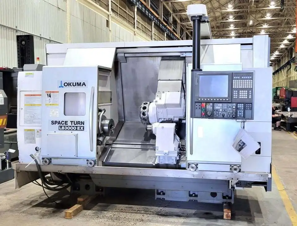 Used CNC Lathe, features a 22.83" swing and 38.19" machining length. Equipped with OKUMA OSP-P300L CNC control, 12-station turret, and Y&C axes. Max RPM: 5,000, power: 30 hp.
