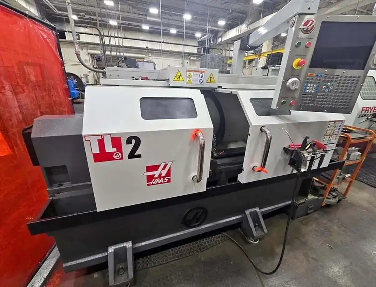 Used CNC Lathe, used. Features include 8" chuck, 2" bar capacity, max turning dia of 16", spindle speed of 2,000 RPM, 10 HP motor, and an 8-position turret. Equipped with full sheet metal enclosure, E-Handwheels, and Haas CNC Control.