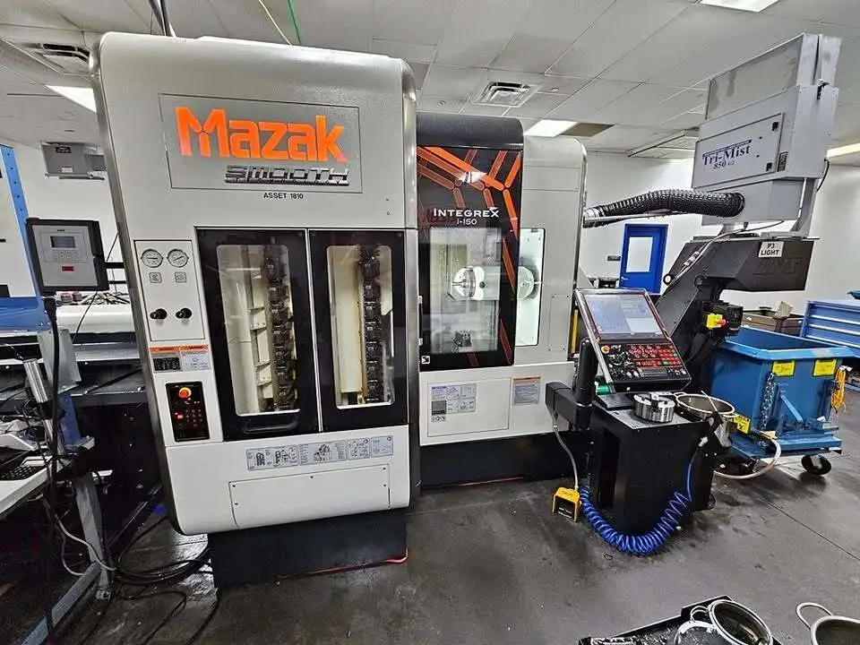 MAZAK Integrex I150, 2018, used 5-axis CNC lathe with 15 HP, 5,000 RPM spindle. Specifications include a 15.75" swing, 15.16" machining length, 8" hydraulic chuck, Mazatrol Smooth CNC control, and high-speed machining options. Equipped with LNS S80 barfeeder.