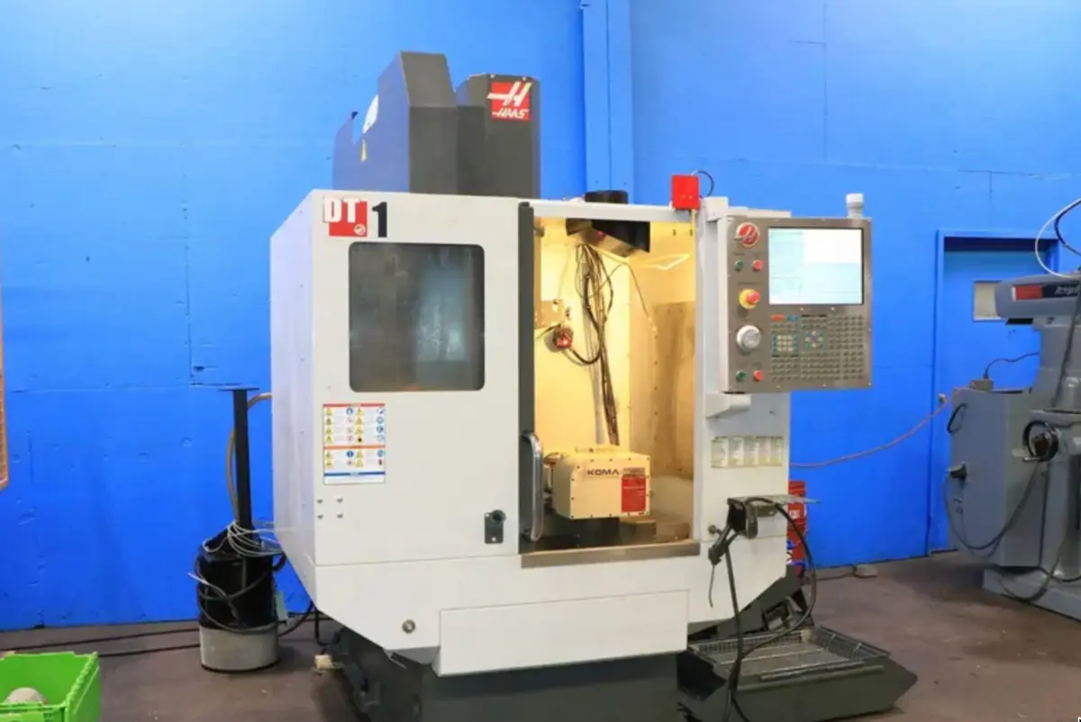2015 HAAS DT-1 with KOMA TN101 trunnion table. Features 5-axis, 20" x 16" x 15.5" travel, 15 hp, 15,000 RPM, 20-position ATC, BT 30, through spindle coolant, chip augers.