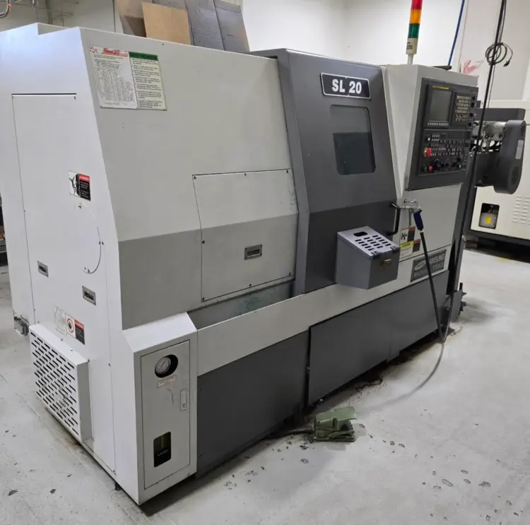 CNC lathe, used, featuring a 17.7" swing, 20.4" machining length, and 8" chuck size. 25 HP with a max RPM of 4,000. Includes Fanuc 0i-TD, chip conveyor, tool presetter, and tailstock.