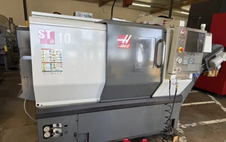2013 HAAS ST-10 CNC Lathe, used. Features: 16.5" machining length, 6.5" chuck, 1.75" bar capacity, and 15 HP power. Max RPM 6,000, 2-axis with tailstock and chip conveyor.