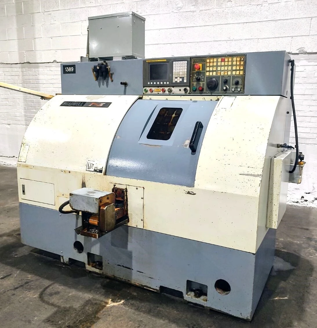 Used CNC Lathe. Features 12.9" swing, 9" machining length, 6" chuck, 1.3" bar capacity, 10 hp power, and max 4,500 RPM. Includes FANUC OI-MATE-TC and auto parts handling.