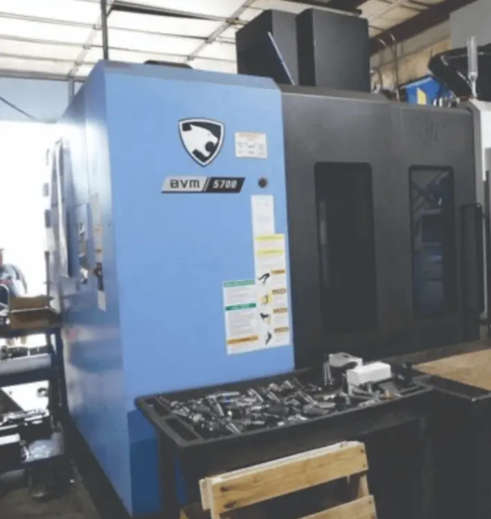 Vertical Machining Center, used condition. Features 41.3" x 22.4" x 18.1" axis travel, 50 hp, 15,000 RPM, BT-40 taper, 3-axis, and includes Turbo LNS HB Barfeeder and Tubo Chip Blaster.