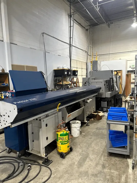 2014 TSUGAMI B0385L Swiss Type Automatic Screw Machine, used. Equipped with Fanuc Oi-TD CNC, fire suppression, Edge Patriot bar feeder, mist collector, and high-pressure coolant. Features include 38mm spindle, 7.5 hp, 6,000 RPM, and 5-axis capability.