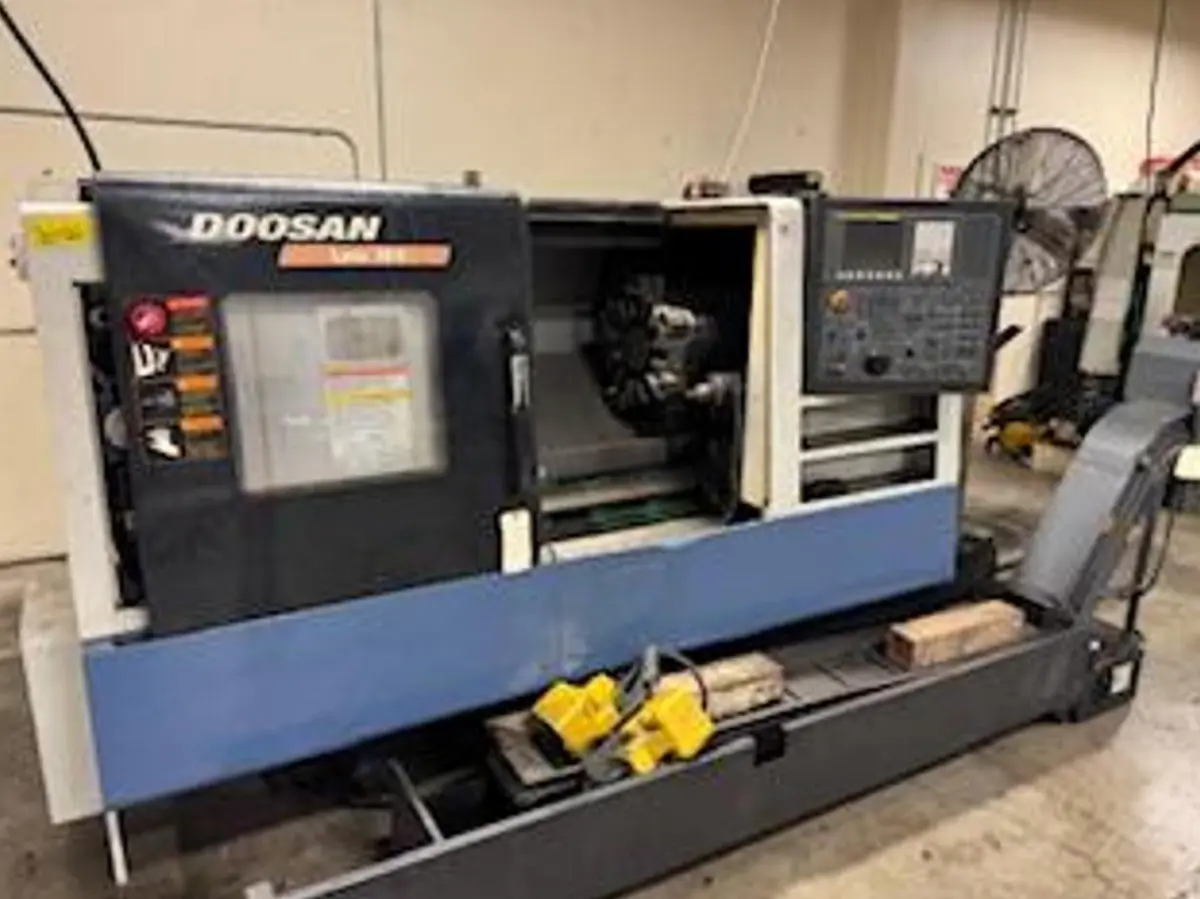 Used CNC lathe offers 2-axis control, a 25.6" swing, and a 30.1" machining length. Features a 10" hydraulic chuck, Fanuc Oi control, and additional equipment like a coolant tank, chip conveyor, and foot pedals.