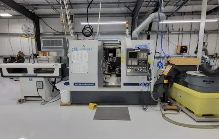 2011 HARDINGE SUPER PRECISION T-42 CNC Lathe. Used condition with features including a machining length of 14.49", 6" chuck, 2" bar capacity, and 15 hp power. Max RPM is 6,000, with live tooling and sub spindle. Includes high-pressure coolant, custom chip control.