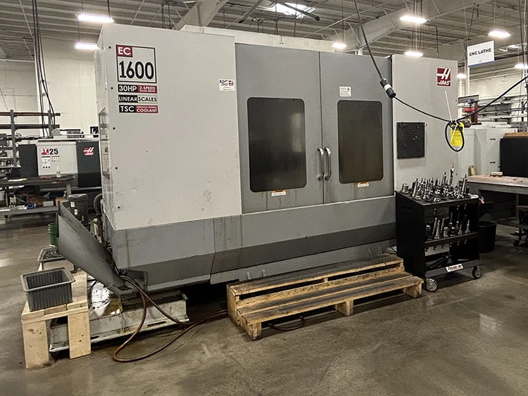 Used Horizontal Machining Center with HAAS control, 4th axis, 30" platter, and dual chip augers. Features include a 30 hp spindle, 30 ATC, and 6,000 RPM.
